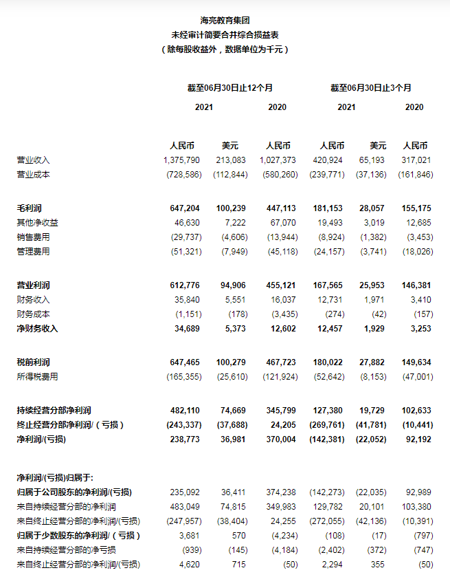 基于国际会计准则第10号合并财务报表的规定,公司认为自2021年9月1日起失去对协议控制的义务教育学校的控制权(详见“期后事项”)。同时考虑到2021年6月30日至2021年9月1日之间为暑期,义务教育学校无实质的经营活动业务发生。因此,公司将义务教育学校业务重分类为终止经营分部,也相应对本年及对比期间的利润表进行了重新列示。