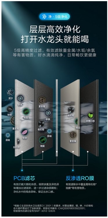 除此之外,在过滤方式的选择上,美的极光净水器采用纯物理过滤,没有化学成分,不影响水的本来结构,安全性更高。5级高精度过滤功能可以有效过滤重金属、水垢、余氯等有害物质,并且补足了物理过滤的短板,守护家庭健康饮水。