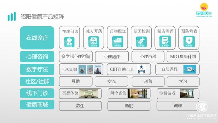 2015年,昭阳健康创始人林昭宇从医院辞职创业,开发了昭阳医生APP,可以说,昭阳医生的问世,就是精神心理数字化的成果。据悉昭阳医生依托移动互联、大数据和人工智能技术,为医患双方搭建了专业、方便、可靠的精神心理诊疗平台。平台上聚焦筛查、预防、诊断、治疗、慢病管理等多个应用场景,为医生提供高效的管理工具,为患者提供方便、可及、专业的问诊服务。目前,昭阳医生已形成在线诊疗、心理咨询、数字疗法、社区/社群、线下门诊、健康商城六大产品矩阵,满足了使用者“预防-诊疗-康复-强化”、从轻到重、从线上到线下、从药物治疗到心理治疗的各层次需求。