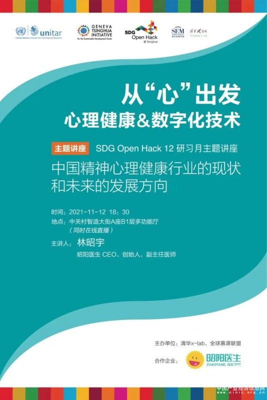 11月11日,由清华大学创意创新创业教育平台(简称“清华x-lab”)、i-Center与清华大学学生全球胜任力发展指导中心联合举办的“2021 SDG开放创新马拉松挑战赛”正式开放报名。昭阳健康研发的、国内领先的精神心理健康辅助诊疗平台昭阳医生成为活动合作伙伴。在12日举办的SDG Open Hack12研习月主题讲座上,昭阳健康CEO、创始人、副主任医师林昭宇带来《从“心”出发 心理健康&数字化技术》专题讲座,解读中国精神心理健康行业的现状和未来的发展方向,研讨如何运营数字化技术保障大众的心理健康,并对观众问题进行答疑。讲座干货满满、精彩纷呈,帮助观众提升了对于精神心理健康的认知和思考,唤醒学子对“人工智能+精神心理”探索的兴趣。