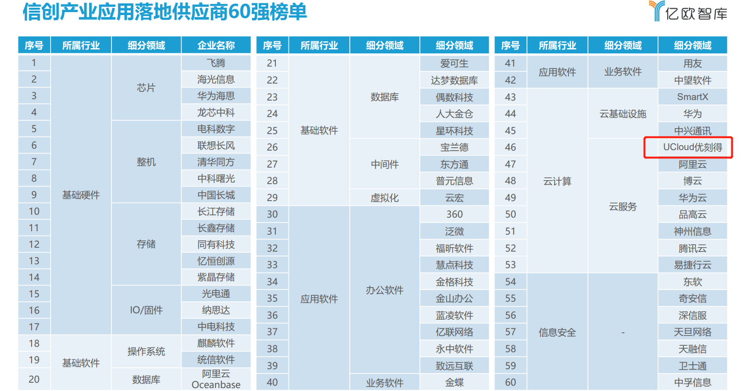 11月12日,UCloud优刻得入选亿欧智库“2021信创产业应用落地供应商60强”,在信创领域的综合发展实力获得肯定。
