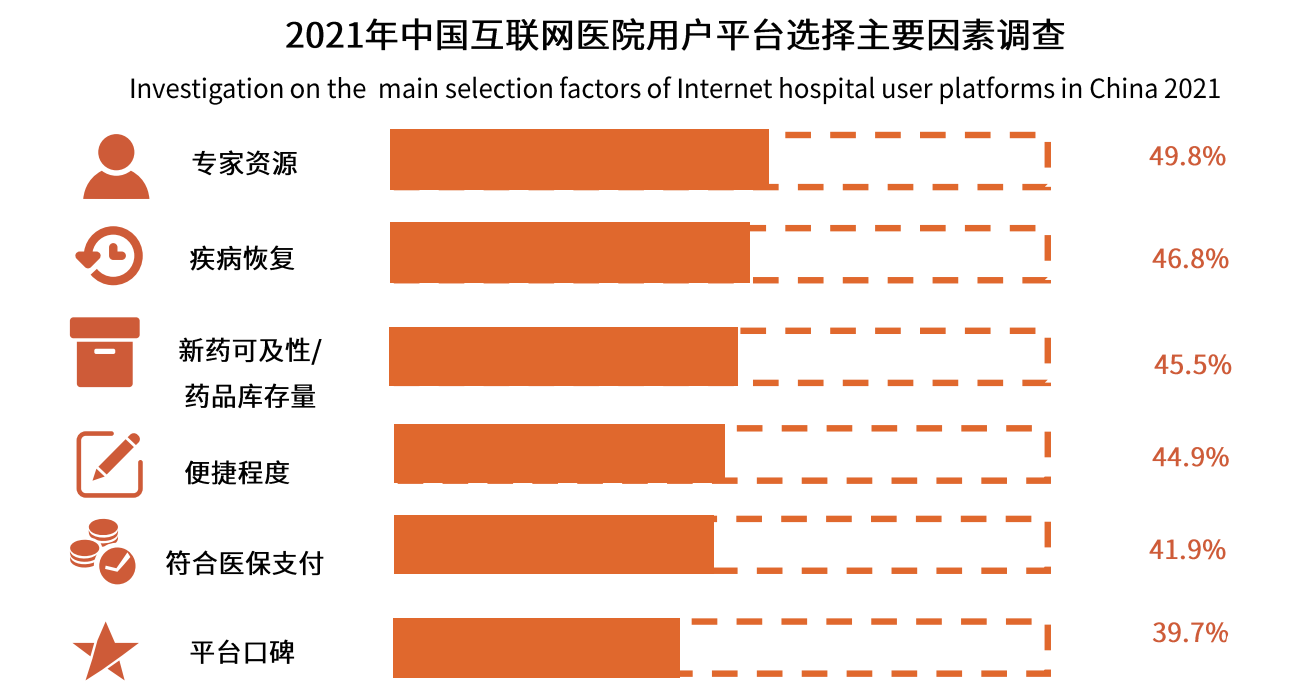 《报告》指出,2021年中国移动医疗健康市场规模预计将达600亿元,互联网医院行业呈稳定上升状态;调研显示,专家资源和疾病恢复是用户选择平台的主要因素,治疗效果是用户的第一诉求;互联网医疗进入规范化发展阶段,像医联这种具有一定专业深度沉淀的平台具有明显优势。