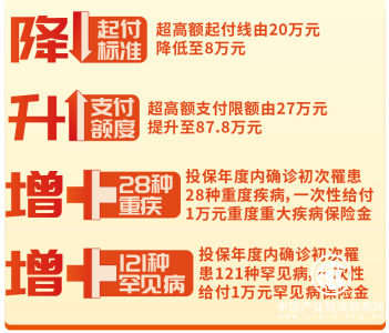 变化的是服务和保障上的全面升级,一是服务水平再提升,推出“一站式”理赔服务,实现零垫付零跑腿,“出院即报销”;二是待遇保障再提升,超高额医疗费用报销范围从50万提升到100万,且50万—100万区间合规费用100%报销。保障层次也拓宽了,恶性肿瘤自费药动态调整,提升恶性肿瘤患者用药的可及性及保障覆盖面。