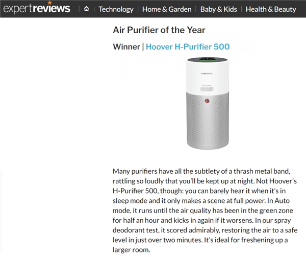 Expert Reviews是一家拥有34年历史的专业测评网站,在此次对空气净化器的测评中,旨在为消费者找到能够快速有效地净化空气并且易于安装和使用的产品。