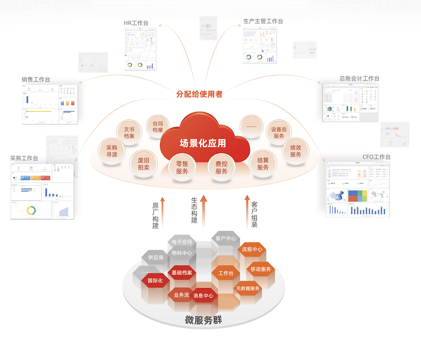 “组装”场景化应用,有点像玩乐高积木,将微服务化的中台通用能力,以及针对不同操作者角色的个性化工作台按应用需求进行组装、叠加。在企业应用中,我们常见的应用场景包括零售服务、费控服务、结算服务、绩效服务、采购寻源、合同档案等,这就像是一个个企业应用APP;消息中心、业务流、元数据服务、移动服务、基础档案等构了丰富的微服务群;而角色化的工作台则是快速便捷的操作入口,管理员可以将一个个场景化应用关联到不同的角色工作台,比如销售业务工作台、库存业务工作台、HR工作台、总账会计工作台等,并分配给使用者,最终用户通过切换工作台获取相应的场景化应用导航。