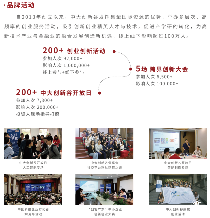 中大创新谷通过举办高端行业交流活动,与知名学者、行业领袖、创投大咖等思想碰撞;通过企业考察,开拓视野,激发创新思维;通过主题交流会、开放日、创新大赛、高峰论坛等活动,聚合创新资源,加速思维碰撞,寻找合作机会。