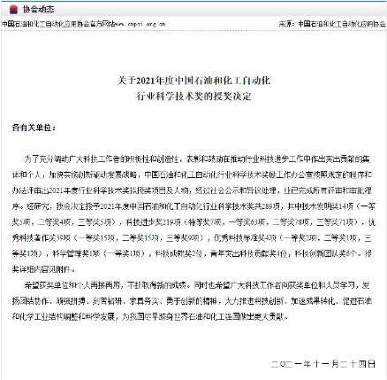 近日,由中国石油西南油气田分公司天然气研究院主持,四方光电参与的“天然气中硫化物光谱检测技术研究及应用”项目荣获2021年度中国石油与化工自动化行业科技进步一等奖。中国石油与化工自动化行业科学技术奖是经国家科学技术部批准(国科学社证字第0109号)设立的,主要评选在石油与化工自动化领域推动行业科技进步工作中做出突出贡献的集体和个人。
