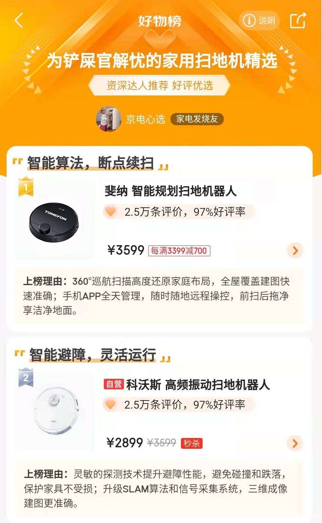 在各大电商平台上随便一搜,全是对斐纳TOMEFON G90扫地机器人的夸赞,好评率几乎100%;而且在扫地机器人好物榜单中,它也是位居榜首。