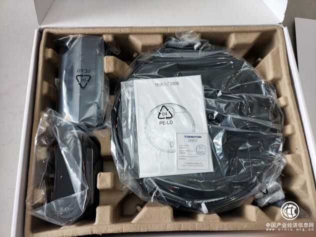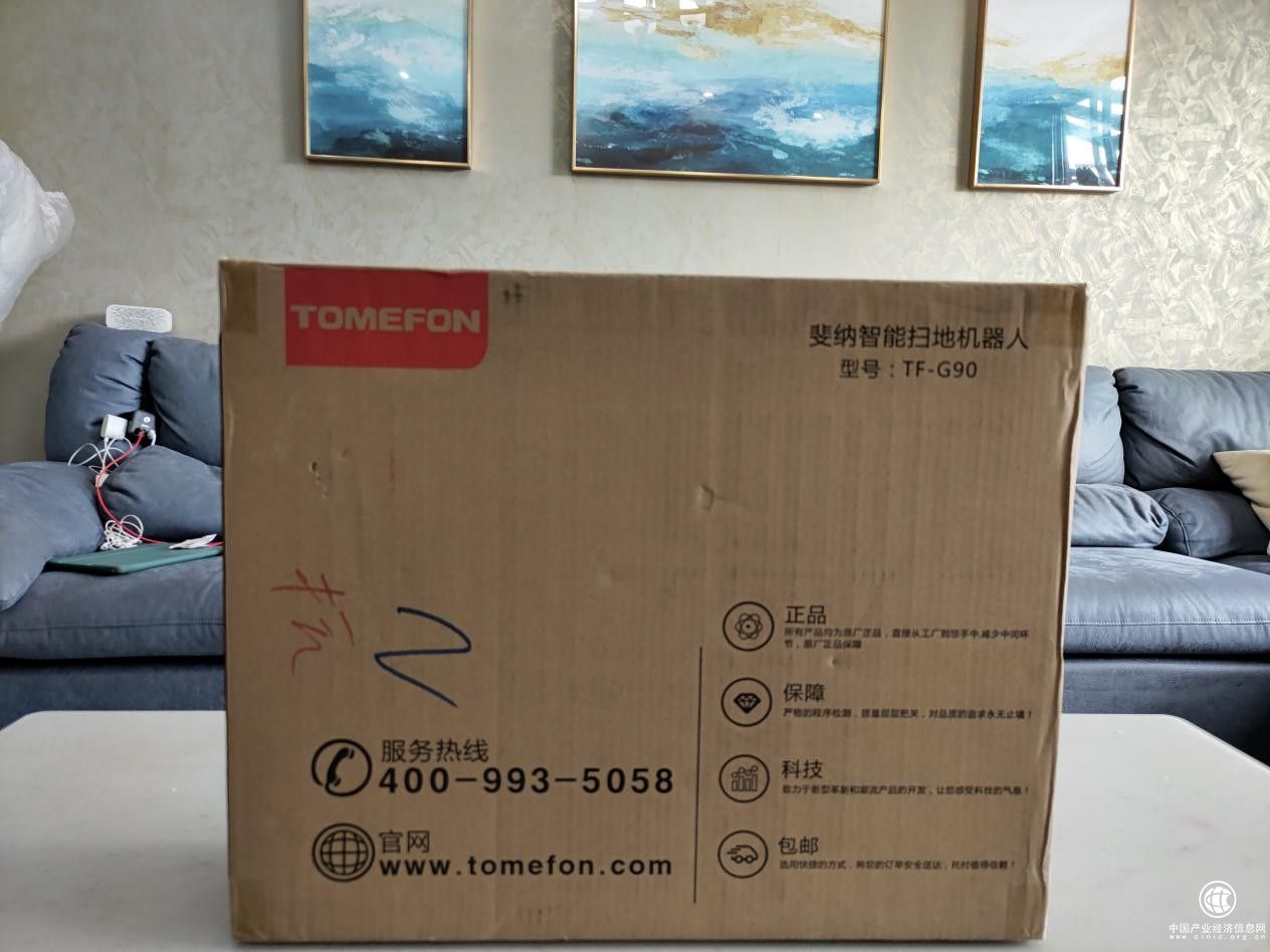 收到货的时候,外面是一层硬纸箱包装,上面标有斐纳TOMEFON扫地机器人的产品型号、服务热线、官网等信息。
