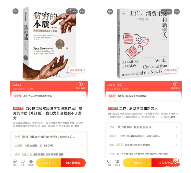 以上几本书籍分别从知识获取、知识传播的角度让大家从不读书的影响中“自救”。而当当网推荐的关于《贫穷的本质》和《工作、消费主义和新穷人》则从另外一个视角审视读书与学习,贫穷与消费的关系。《贫穷的本质》作者为2019年诺贝尔经济学奖得主阿比吉特·班纳吉,他深入剖析全球贫困的本质,探究如何逃离“贫穷陷阱”;《工作、消费主义和新穷人》由著名社会学家齐格蒙特·鲍曼所著,他解读消费主义下的贫穷迷思,追溯现代历史上发生的变化,对其社会后果进行盘点,探讨与贫困作斗争和减轻困苦的各种方式的有效性。长期不读书的穷忙族,也可以通过深度阅读此类书籍提升思维高度。