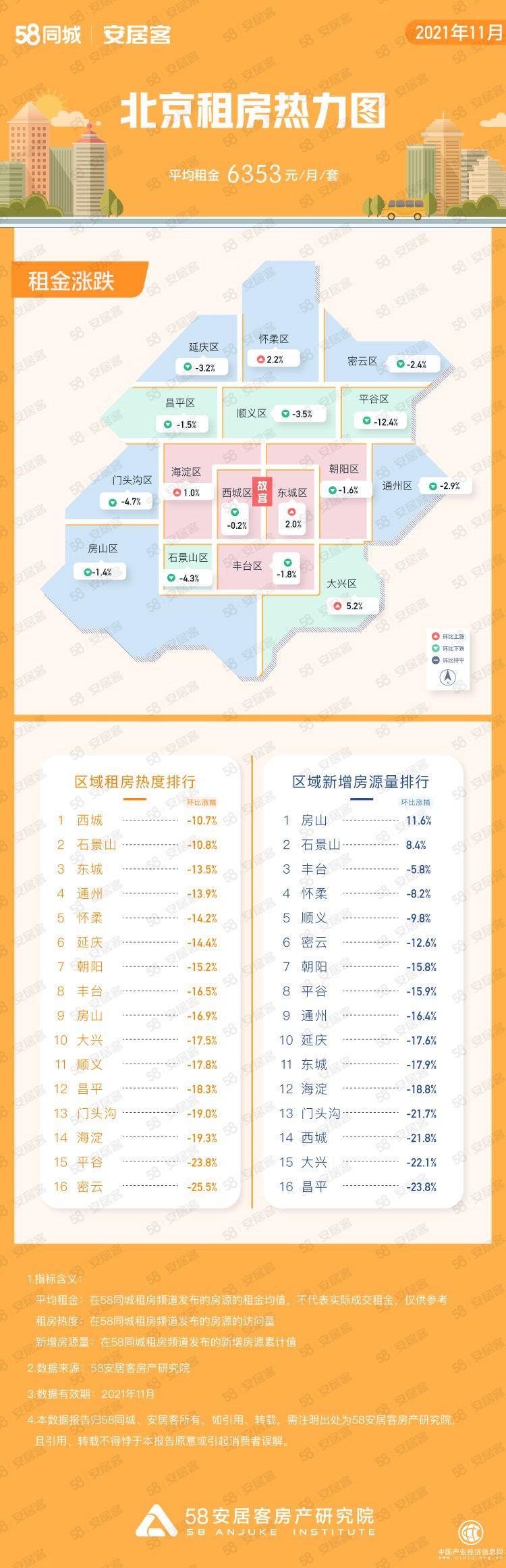 58同城、安居客《11月份重点城市租房趋势报告》显示,11月份一线城市中北京平均租金为6353元/月/套,大兴区、怀柔区、东城区和海淀区平均租金环比出现上升,不过波幅不大,总体租金水平平稳。受11月租房季节性淡季影响,在租房热度和新增房源量方面,北京各区均出现一定程度下滑,不过仍处于合理范围内,其中西城区、石景山、东城区、通州区、怀柔区等区域租房热度相对靠前;在众多区域中,房山、石景山新增房源量逆势上涨,其中房山环比上涨11.6%,石景山环比上涨8.4%。