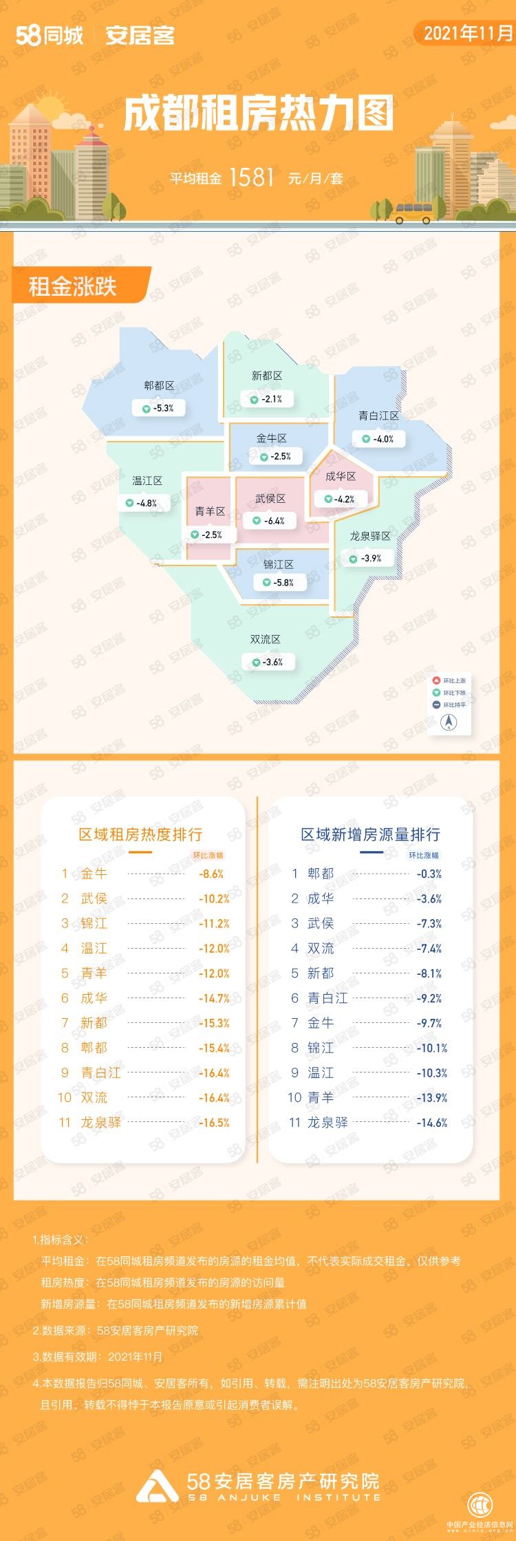 58安居客房产研究院监测数据显示,新一线城市成都11月份成都平均租金为1581元/月/套,各区域租金环比上月均出现微跌态势。11月份成都市租房热度同样出现降温现象,金牛区、武侯区、锦江区、温江区、青羊区租房热度相对较高。成都各区域新增房源量方面,郫都区变化最小,环比上月微跌0.3%。