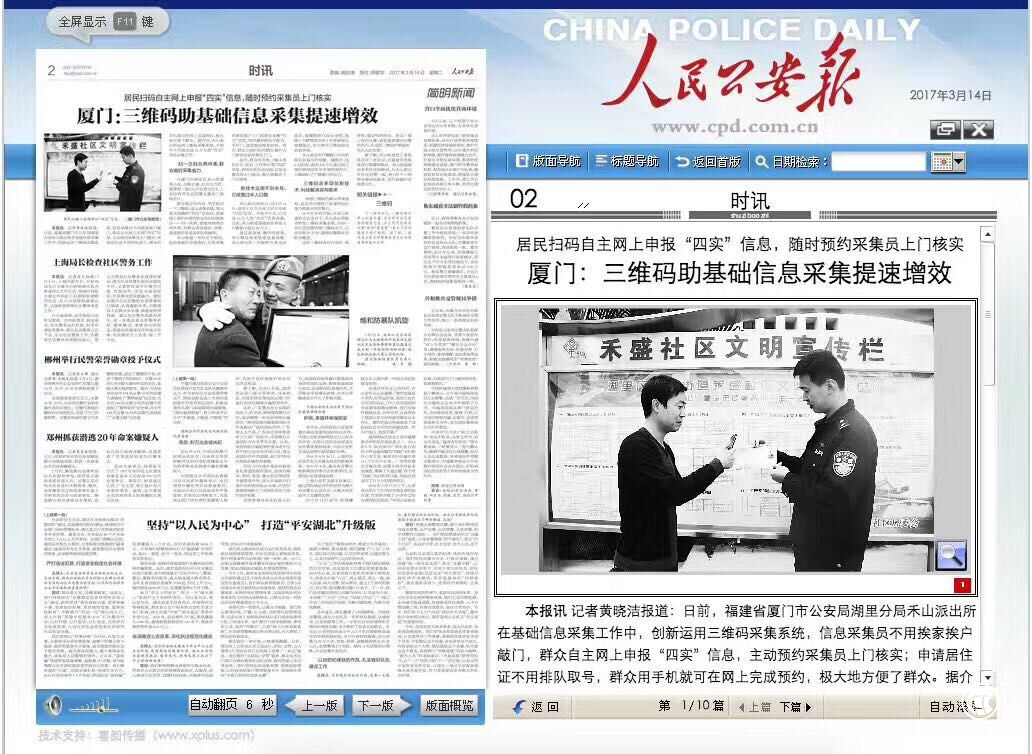 厦门金砖会晤期间,三维码助力厦门市公安局开发“四实”采集系统,确保了厦门市基础信息采集能够更高效、更快速、更省力的完成。据不完全统计,不到半个月时间就完成10万人的“四实”信息采集工作,采集速度是传统人工的几十倍。