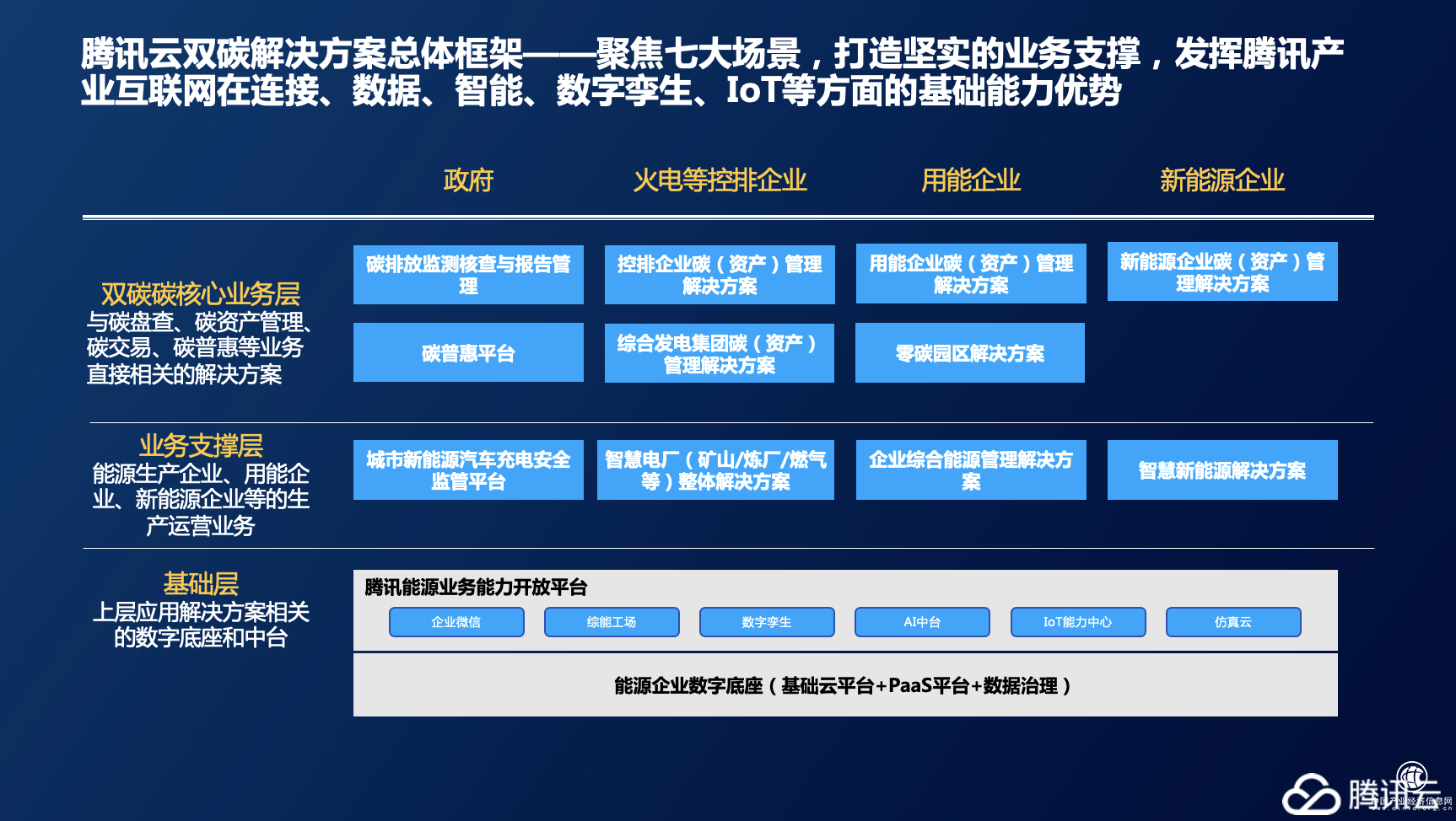 腾讯云双碳解决方案总体框架——聚焦七大场景,打造坚实的业务支撑,发挥腾讯产业互联网在连接、数据、智能、数字孪生、IoT等方面的基础能力优势。