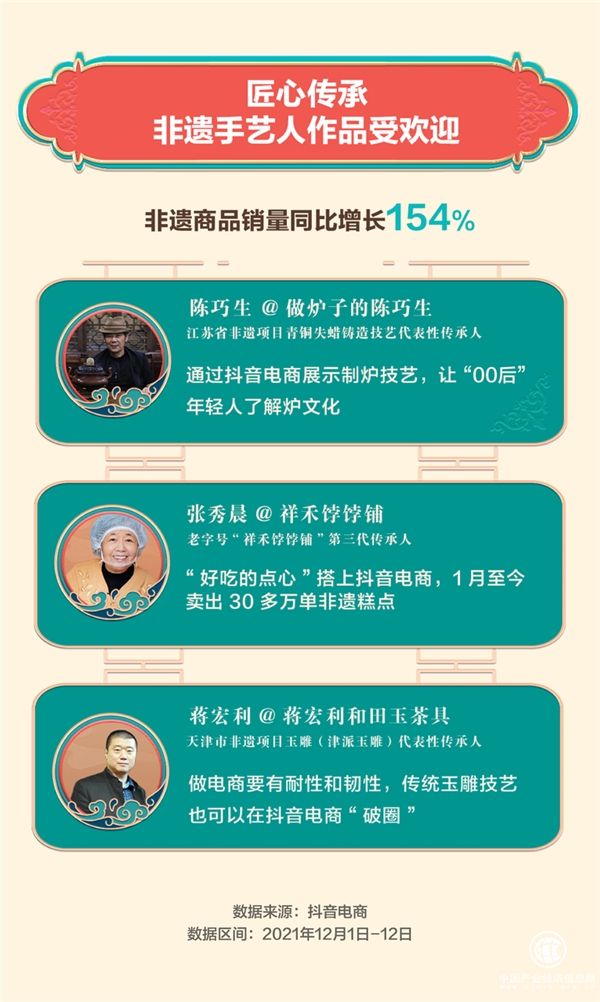 数据显示,“双12”期间,抖音电商重点推介非遗传承人和其手工艺品,并推动非遗商品销量同比增长了154%。在“看见手艺计划”的支持下,手艺人们在抖音讲述商品背后的历史,让“买卖”助力匠心传承。