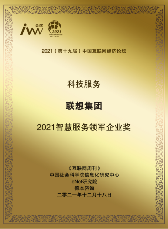 无独有偶,近日,由《互联网周刊》、中国社会科学院信息化研究中心、eNet研究院、德本咨询联合发布了互联网经济论坛的最高荣誉“金i奖”,并将备受瞩目的ICT服务类重磅大奖“2021智慧服务领军企业将”授予了联想智慧服务。