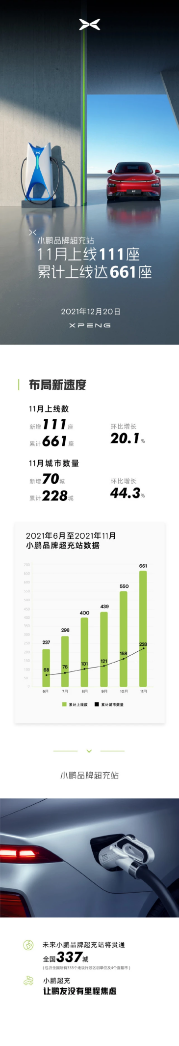截止目前,小鹏汽车累计超充站数量达到661座。截至11月,小鹏超充站覆盖城市数量新增70城,环比增长44.3%,累计228城。