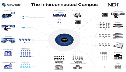 除此之外,在远程课堂应用上,NewTek的广电AV技术,让画面传输更清晰流畅,实现低延时实时互动。搭配鸿合丰富的课堂应用,实现师生0距离、沉浸式远程教学体验。还可以利用NDI技术打造统一的信息化校园管理平台,为教育用户打造校园节目制作中心、课件录制中心、录播及直播中心、监控及运维中心,将会对校园多媒体制作及管理的水平带至新的高度。