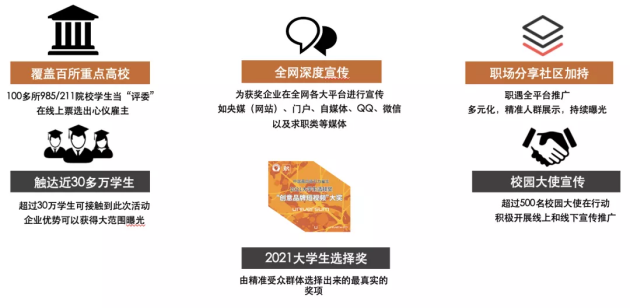 正如其名,“大学生选择奖”完全由大学生做主,是目前市场上唯一根据大学生的喜好倾向来遴选针对企业在雇主品牌推广&招聘营销活动领域内的奖项。它基于优兴咨询及优质职场内容分享社区“职遇”(UCareer)长期积累形成的庞大年轻受众,共享丰富的高校资源及渠道,致力于搭建企业与潜在候选人之间的沟通桥梁,促进双方开展亲密无间的对话及互动。凭借大学生的反馈,企业能及时洞察自己在雇主品牌推广及培养青年人才时所遇到的痛点和问题,从而进行有针对性地改善及提升,优化雇主品牌建设,加速雇主品牌传播,有力塑造出对职场“后浪”极具吸引力的雇主形象。