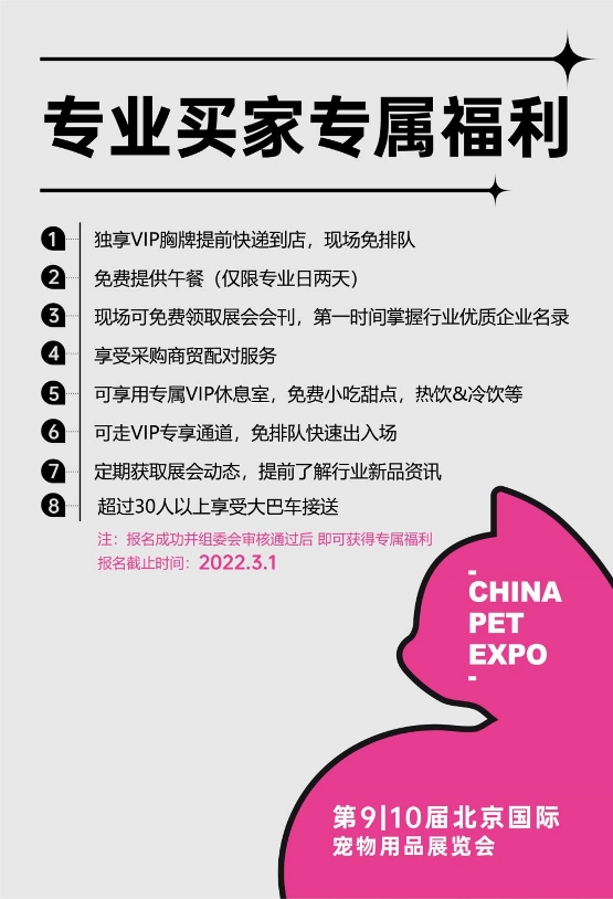 2022年雄鹰京宠展将于4月1-4日在中国国际展览中心(顺义新馆)盛大召开!明年将有1200+优质企业参展、8000+优质品牌、120000+展出面积,预登记全面开启~ 快来报名吧!