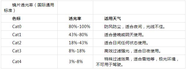 备注:滑雪镜透光率也有分等级,正如日常见到的CAT.1,2,3,4,具体的划分标准如下表: