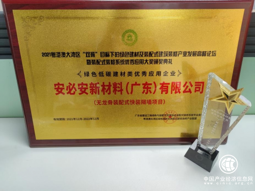 2021年12月23日,安必安新材料(广东)有限公司在2021粤港澳大湾区绿色建材及装配式建筑装修发展高峰论坛暨装配式装修系统优秀应用大奖颁奖典礼上荣膺“绿色低碳建材类优秀应用企业(无龙骨装配式快装隔墙项目)”奖项。公司董事长兼CEO顾骁先生出席了颁奖仪式。