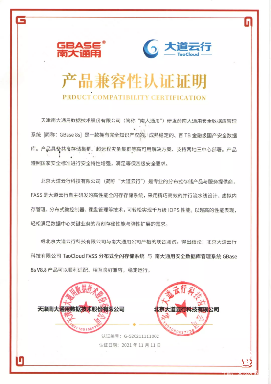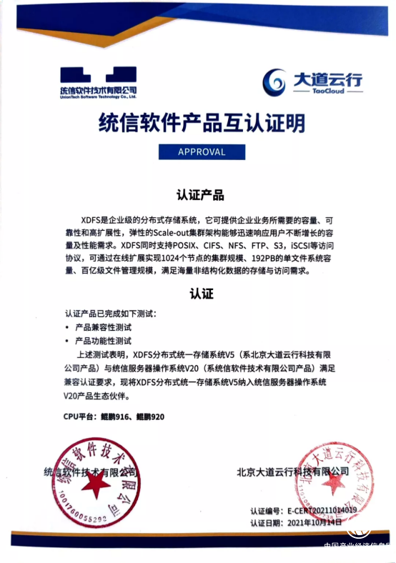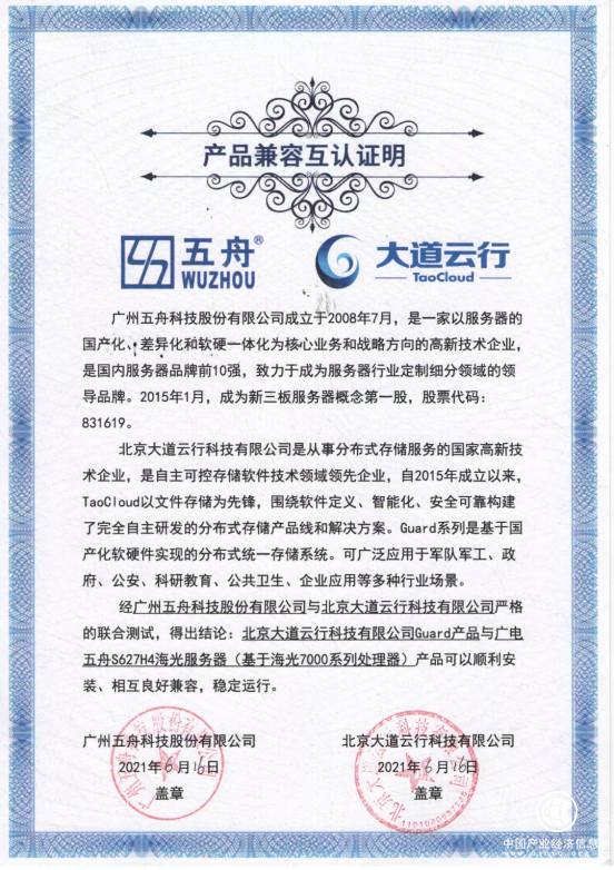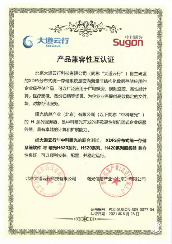 近日,大道云行产品相继通过了华为、兆芯、统信、普天、中科曙光、中科方德、南大通用、五舟科技、精容数安及星环科技10家软硬件厂商的认证,并顺利拿到了16款产品兼容性互认证书,充分说明了大道云行产品具有高可用性和功能完备性,完全满足用户多样化的应用需求,可充分释放“数字基建”潜能,更是为发展和完善国产化生态体系添砖加瓦。