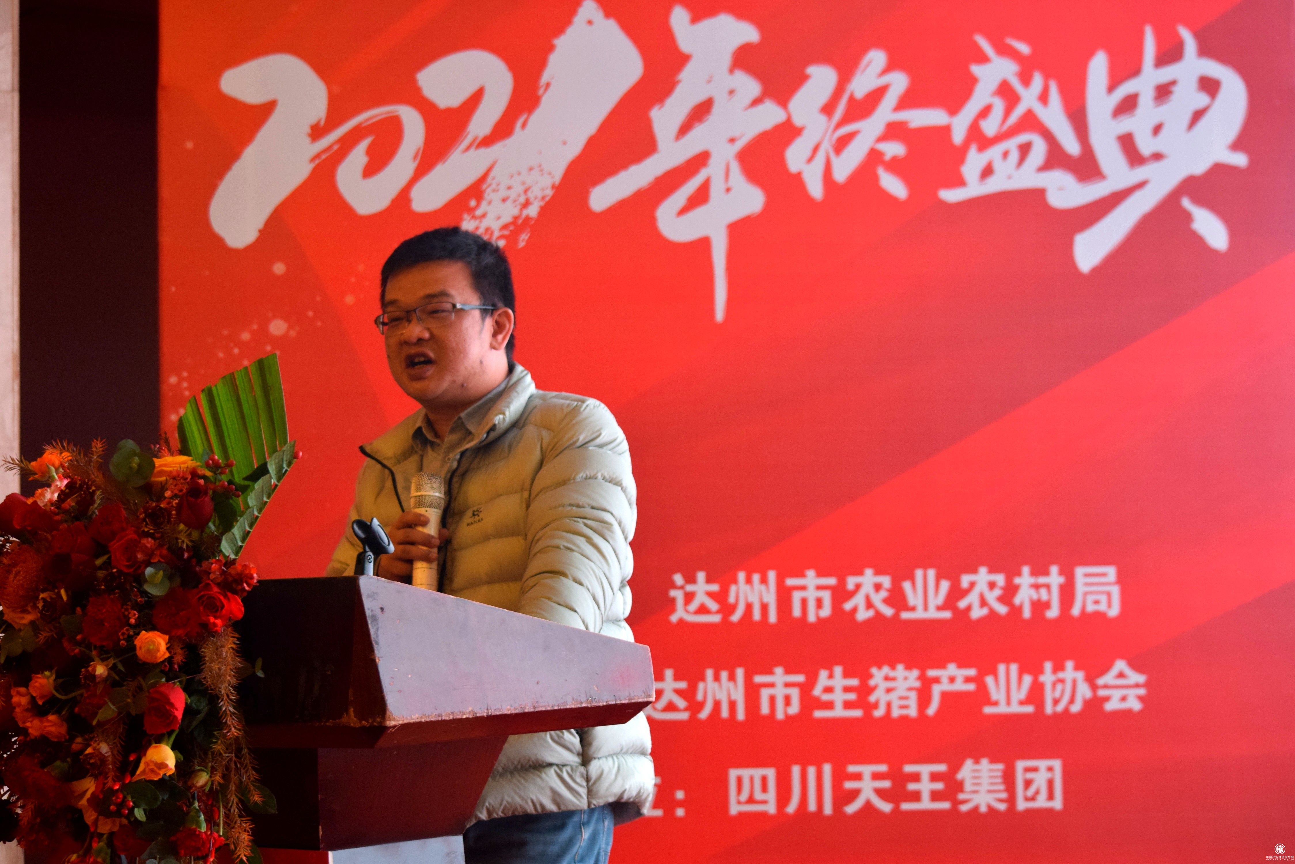 (图为达州市生猪产业协会会长张春雷在大会上作总结,回顾协会一年的工作)