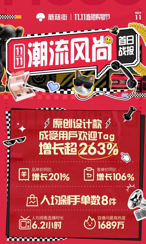 战报显示:今年的双11蘑菇街用户人均消费额(客单价)同比去年增长106%,商品单价同比增长201%。双11期间,蘑菇街用户人均观看直播时长达6.2小时。蘑菇街客单价、品单价、客件数均取得明显增长,且原创设计女装领域取得重大突破。
