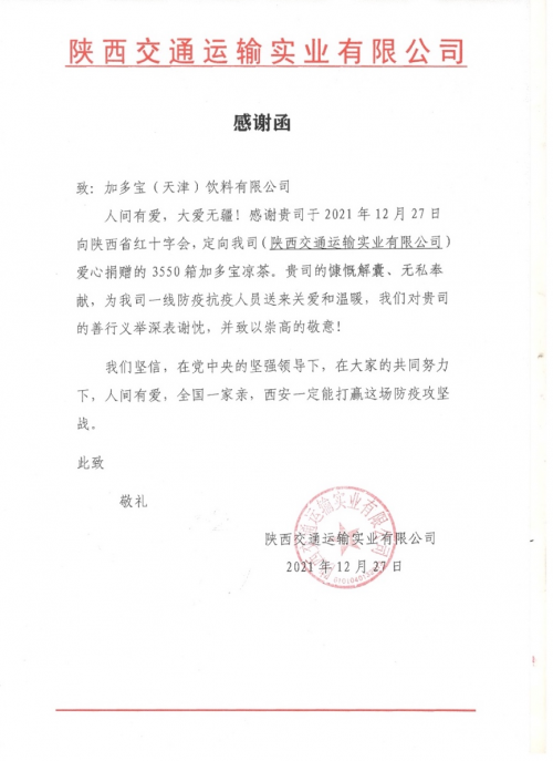 陕西交通运输实业有限公司向加多宝集团发出感谢信:“贵司的慷慨解囊,无私奉献,为我司一线防疫抗疫人员送来关爱和温暖,我们对贵司的善行义举深表谢忱,并致以崇高的敬意!”对加多宝快速响应,精准驰援,协同抗疫的善举表示感谢。陕西交通运输实业有限公司作为陕西交通控股集团有限公司下属子公司,会同陕西交控服务区集团、陕西交控集团运营管理公司等兄弟单位,目前重点负责高速公路出入口、服务区、客运站、城市交通的正常运营及防疫抗疫工作,交控集团权属公司还迅速抽调2600人深入全市各社区支援抗疫一线。