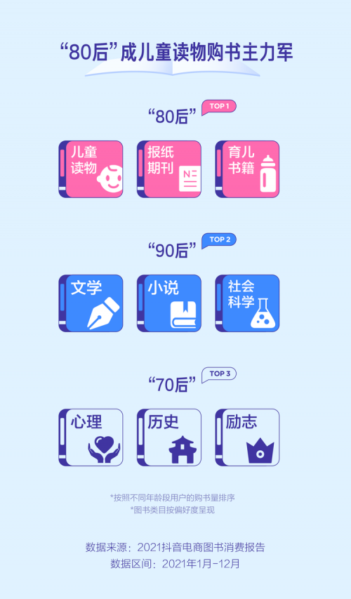 报告还呈现了不同地区和不同年龄段读者在该平台的购书偏好。数据显示,2021年广东人在抖音电商的买书量居首位,山东、江苏、河南、浙江位列其后。与2020年购书量相比,湖北人2021年在抖音电商的购书量有显著提升,增幅最大。“80后”读者是抖音电商的购书主力军,最爱选购儿童读物、育儿书籍。“90后”则更爱文学和小说,“70后”关注心理学书籍更多。
