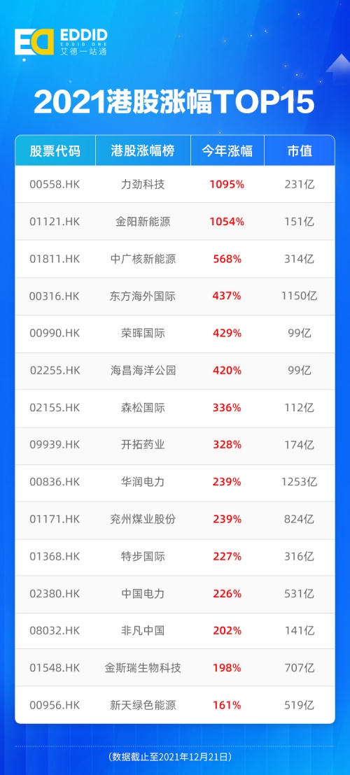 剔除市值百亿以下的股票,结合板块热度,本文整理出2021年港股涨幅Top 15排行榜。