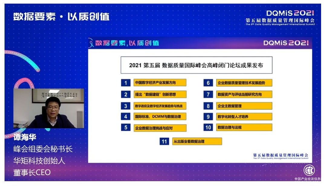 作为峰会主论坛的重磅环节,峰会组委会秘书长谭海华先生代表本次闭门论坛与会嘉宾,发表了成果总结报告——《2021 第五届 数据质量管理国际峰会关于中国数据治理发展趋势的几点看法和建议》,就以下11个话题解读了该报告的主要内容: