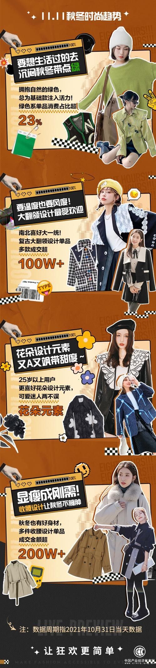此外,蘑菇街在战报中还一并发布了《双十一秋冬时尚趋势》,涵盖2021秋冬流行色、2021秋冬最受欢迎女装款式,2021流行设计元素等潮流趋势内容,为秋冬女装消费提供参考。