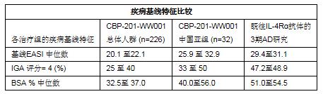 •为了支持与中国监管机构的沟通,本研究预先计划了对中国亚组人群数据进行分析。相对于整体研究人群,中国亚组人群(n=32)在基线时EASI 评分的中位数更高、IGA 评分= 4 的比例更高、BSA皮肤受累面积更大。如下表所示,中国亚组人群中入组的患者,显示出CBP-201有更大的治疗获益。