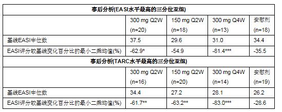 •根据EASI评分高低,对基线时疾病严重程度较整体研究人群高的亚组患者(n=69)进行了探索性的事后分析,结果显示出该组人群的EASI评分较基线下降更多且安慰剂效应更低。类似地,对本研究中相较于整体人群具有更高的基线胸腺和活化调节趋化因子(TARC或者CCL17,一种与AD患者疾病活动度相关的生物标志物)水平的患者(n=69)也进行了事后分析,显示出他们也较研究整体人群获得了更多的EASI评分下降及更低的安慰剂效应。