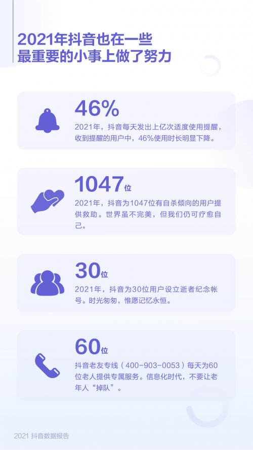 此外,在报告中,抖音还公布了其2021年在产品人文关怀方面做出的更多尝试。报告显示,过去一年,抖音为1047位有自杀倾向的用户提供救助,也为30位用户设立逝者纪念帐号。而针对老年人如何良好拥抱数字生活的问题,抖音推出了多项适老化举措。其中,抖音推出的“老友专线”,每天为60位老人提供专属服务。
