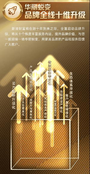 在新十年发展目标指引下,新湖财富全线十维进阶,品牌将从买方投研升级化、产品构成生态化、传承服务专业化、生态体系开放化、客户服务精细化、合规建设严格化、风控体系严密化、战略方向落地化、财富管理数字化、人才队伍精英化这十个维度全面升级。品牌升级后的新湖财富,未来将持续不断积累智慧,持续赋能,立足更高远的战略、更深入的思考,成就财富管理服务的中国模式。