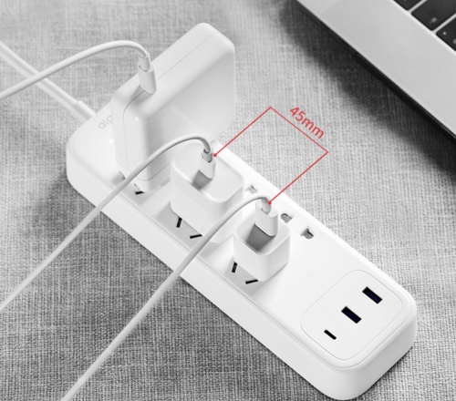 我们知道,很多插座都有孔距不合理的问题,经常要一个大型插头占两个位置,资源浪费的同时,也对美观造成了影响。aigo国民好物在设计上注重细节,三个组合孔之间各相距45mm,满足了电源插头对于间距的需求,拔插完全不会受影响,实用性超强。
