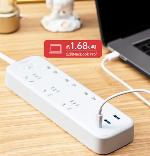 这是一个讲究高效的时代,充电速度快也是高效的重要表现之一。aigo六位延长线插座65W PD版的USB-C接口输出功率可达65W MAX,为MacBook Pro笔记本电脑充电只要1.68小时就能充满,对于总是忘记充电的人来说,简直就是大救星。