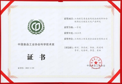 12月17-18日,以“科技·洞见未来”为主题的2021中国食品工业科技进步大会在郑州召开,会上颁发了“中国食品工业协会科学技术奖”。煌上煌承担的科研项目“江西特色酱卤禽肉制品的保鲜和冷链物流关键技术及其产品研发”获得了中国食品工业协会科学技术奖一等奖,煌上煌股份公司副董事长褚剑被授予“全国食品工业科技创新领军人物”荣誉称号。该奖项是煌上煌获得2018-2019年度中国食品工业协会科学技术特等奖后,2020年度再次获批,体现了煌上煌技术创新的持续性。