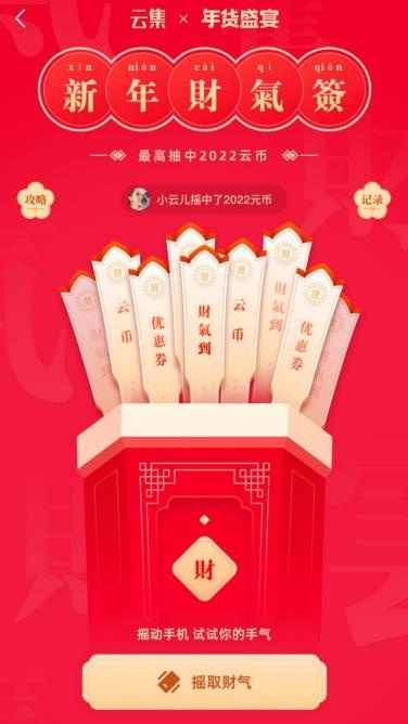 从1月10日起,云集APP将推出全场满减券、下单发福袋、百万红包雨等优惠活动。为增加与消费者的互动玩法,云集还推出新年财气签活动,用户摇一摇就能抽到大额券、云币等,最高可获得2022云币红包。