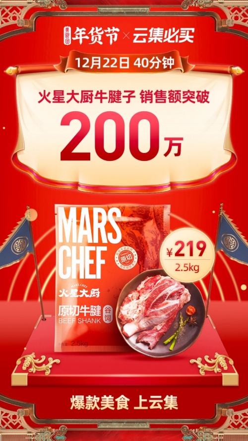 年货节期间,“美食团”每天为消费者精选20多款商品,12月22日,其主打的火星大厨牛腱子5斤装仅售219元,优惠力度吸引了不少消费者,上线仅40分钟,销售额就突破200万元。