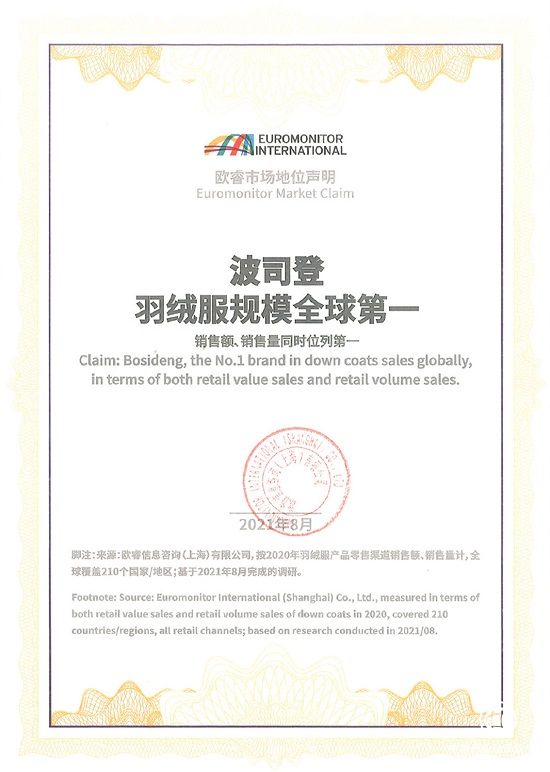 多年良好的经营成果让波司登享誉国际,中国品牌在国际上的影响力显著提升。2021年4月,国际五大品牌价值评估权威机构之一Brand Finance,公布了每年一度的《全球最具价值服饰品牌排行榜50强》。榜单显示,中国品牌波司登赫然在列,且以销售增速第三(39%)的成绩入选。2021年8月,世界权威调研机构欧睿国际发布全球羽绒服调研报告,结果显示:波司登羽绒服规模全球第一,销售额、销售量同时位列第一。