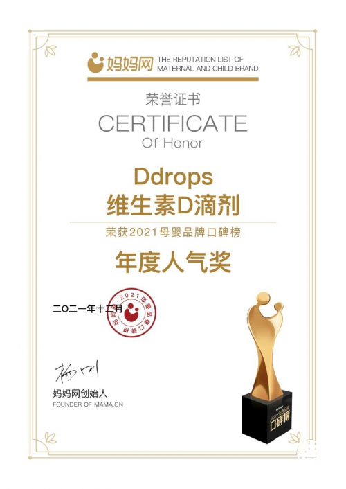 在经过激烈的角逐后,Ddrops在众多的母婴品牌中突出重围,一举拿下“年度人气营养品”、“年度匠心金橙奖”、“年度金质口碑奖”、“年度人气奖”;不仅充分说明了妈妈们对Ddrops的高度喜爱和认可,更彰显了Ddrops在营养品中的品牌实力。