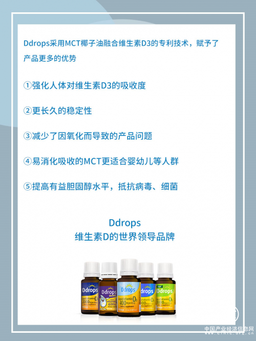 专利MCT基底油还具有提高稳定性、能提高维生素D3的吸收度、进一步提高人体免疫力的优势。选用天然羊毛脂作为维生素D3的提取来源,更纯净、安全;此外,0糖0香精0防腐剂0人工添加剂也成为了很多妈妈坚定选择Ddrops的原因。