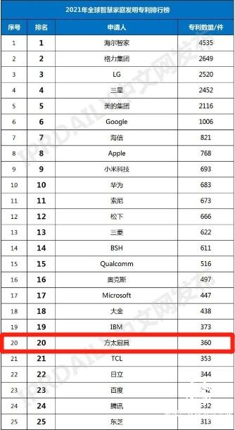 1月7日,知识产权产业媒体IPRdaily与incoPat创新指数研究中心联合发布《2021全球智慧家庭发明专利TOP 100》排行榜。厨电科技领军品牌方太以360件智慧家庭发明专利入选2021全球智慧家庭发明专利榜TOP 20,蝉联厨电行业第一。