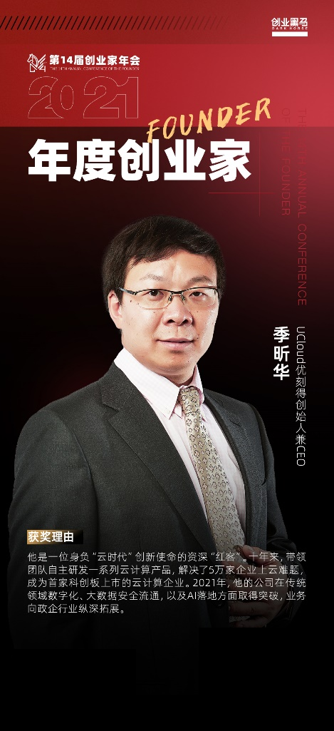 1月13日,在创业黑马主办的“第十四届创业家年会上,UCloud优刻得创始人兼CEO季昕华获得“2021 年度创业家”荣誉称号。