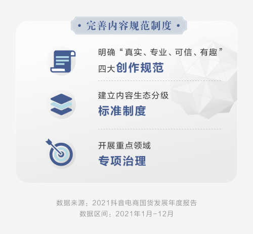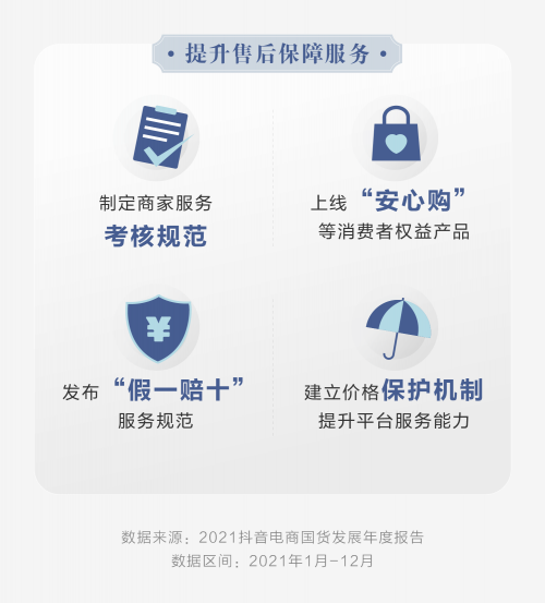 2021年,抖音电商通过提升售后保障服务、提升消费体验、完善内容规范制度等,在商家、消费者、内容创作者多端、多维度提升平台的整体服务能力。