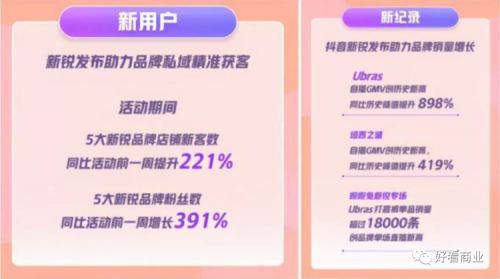整个2021年,Ubras借助“抖音新锐发布”、“抖音开新日”等多个为新锐品牌成长加速的营销IP,实现销量与声量齐涨。比如在2021年3月,“抖音新锐发布”刚推出不久,就集合Ubras在内的五家新锐国货品牌,为消费者带来一场“向往的‘轻’生活”极致体验。在这次活动期间,新锐品牌总GMV环比活动前一周提升221%;Ubras无尺码内衣成直播间爆款单品;Ubras自播GMV也创历史新高,同比历史峰值提升898%。此后,Ubras推出全新品类“Ubras肌底衣”,又联动“抖音开新日”,实现了销量与品类占位的双赢。在那次上新季活动中,Ubras触达用户超1亿,有3款独家礼盒上线即售罄。